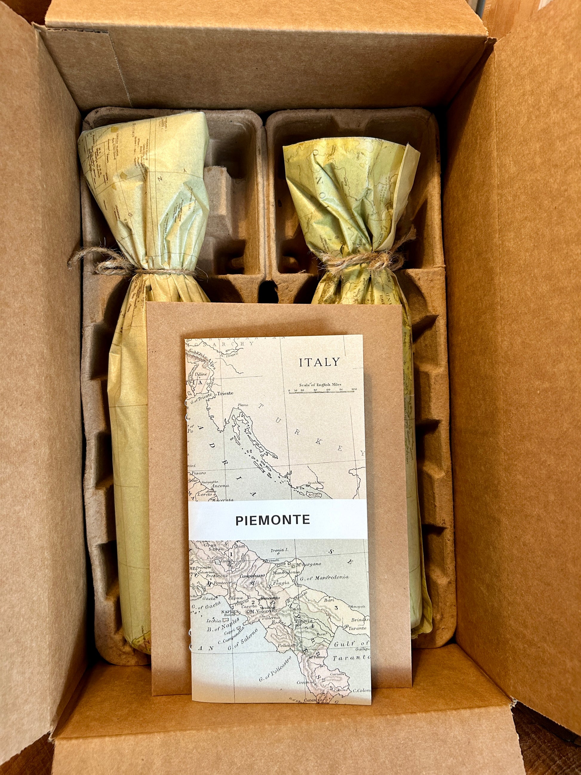 Box includes 2 gift wrapped wines, Bottivino note card and a 'Piemonte' educational booklet featuring a 6-page narrative exploring geography, soils, climate, grapes and cuisine.